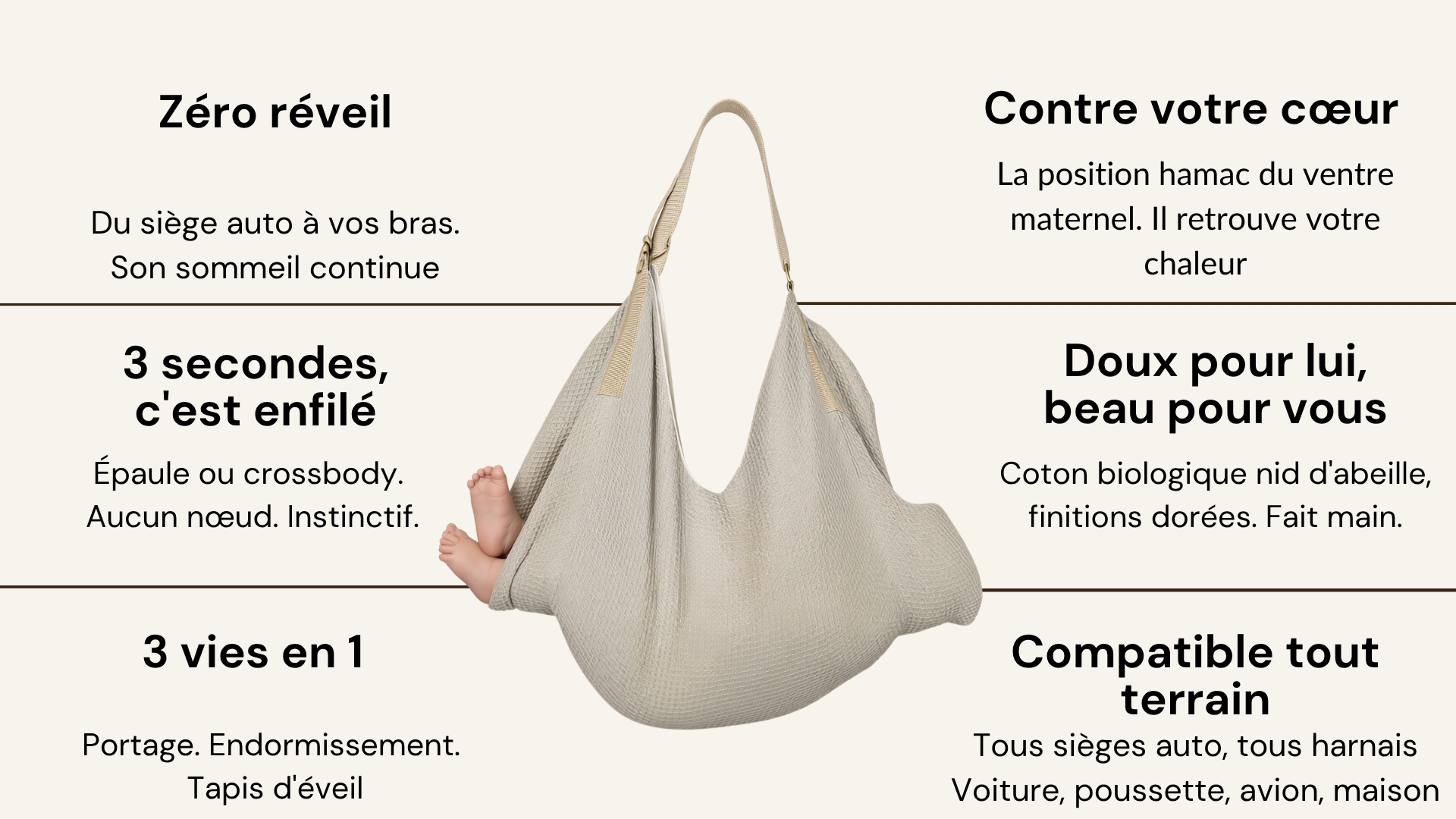 Ma belle-mère brésilienne a accroché le Cocon à la porte, a bercé Diego, endormi en 3 minutes. "Ma mère faisait pareil avec un drap." Sauf qu'avec le Cocon je le sors aussi de la voiture sans le réveiller.